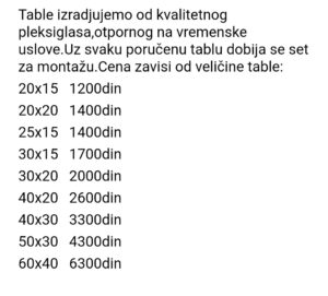 Funkcionalnost pleksiglasnih tabli je još jedan važan aspekt. Mogu se lako obrađivati i prilagođavati različitim oblicima, veličinama i dizajnima, što omogućava preciznu izradu logotipa, brojeva i tekstova. Osim toga, pleksiglas može biti opremljen LED osvetljenjem koje poboljšava vidljivost i privlačnost reklame, posebno noću ili u lošim svetlosnim uslovima.
